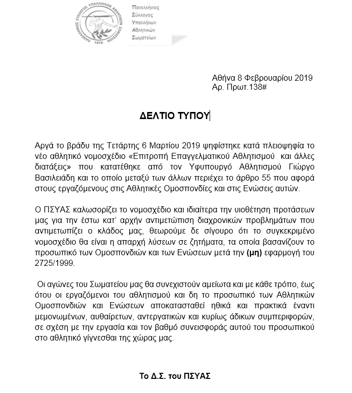 Το σωματείο εκφράζει την ικανοποίηση του για την ψήφιση του Αρθ.55 στο Ν/Σ για τον Αθλητισμό και βεβαιώνει ότι συνεχίζει τις προσπάθειες του για την κατάκτηση όλων των στόχων του που αφορά στους εργαζόμενους μέλη του, σε αθλητικές ομοσπονδίες και ενώσεις.