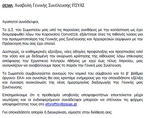 Επισυνάπτεται το κείμενο επιστολής που εστάλη στα μέλη μας για την αναβολή της προγραμματισμένης Γεν.Συνέλευσης και αρχαιρεσιών του Σωματείου μας.